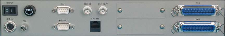IN 外部サンプリングクロック入力として使用します。TTLレベル入力で、クロックの立上りに同期してサンプリングされます。 ■CLK OUT サンプリングクロックが出力されます。計測・制御中にサンプリングクロックと同期したパルスを出力します。TTLレベル出力で、クロック幅が1μsecのパルスを出力します。 ■CAN CANインタフェースコネクタです。(オプション機能) ■RS-232C メンテナンス用に使用します。 ■Ethernet 100BASE-TXケーブルを使用しホストコンピュータと接続します。通常、PCとはクロスケーブルで接続します。 ■DI16 ディジタル入力コネクタです。36ピンアンフェノールコネクタを使用します。 ■DO16 ディジタル出力コネクタです。36ピンアンフェノールコネクタを使用します。 ■POWER 電源スイッチです。 ■DC IN DC+12Vを接続します。 ■FG 接地用端子です。 |